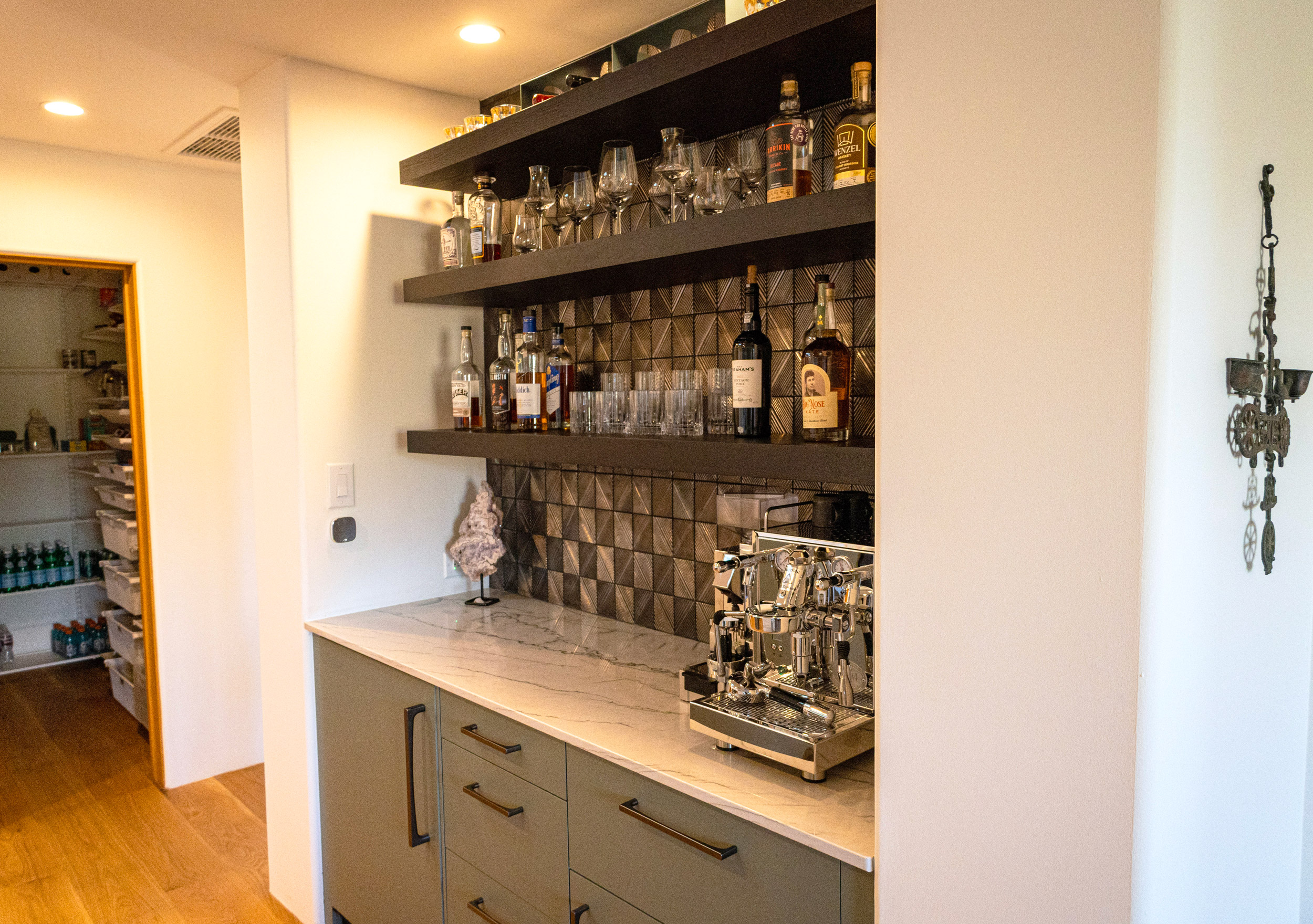 Rich, wide-plank white oak hardwood floors now run throughout the space, bringing warmth and cohesion to every room. At the heart of the home, a newly redesigned kitchen features custom cabinetry built for both beauty and function, complemented by elegant stone countertops and handmade tile backsplashes that add texture and soul.