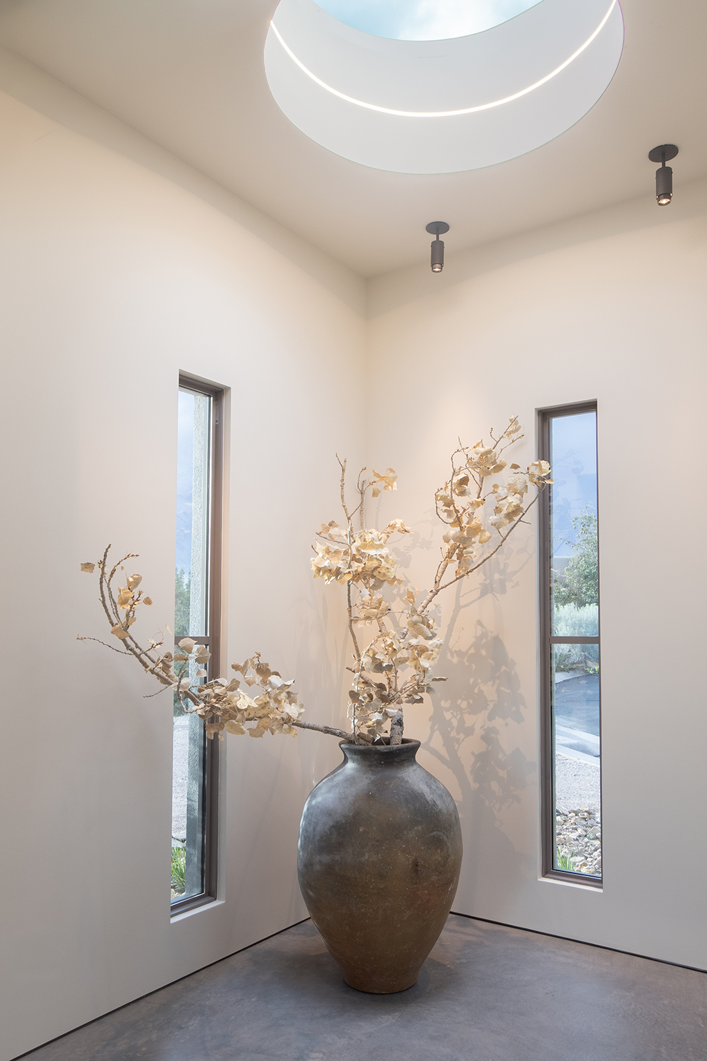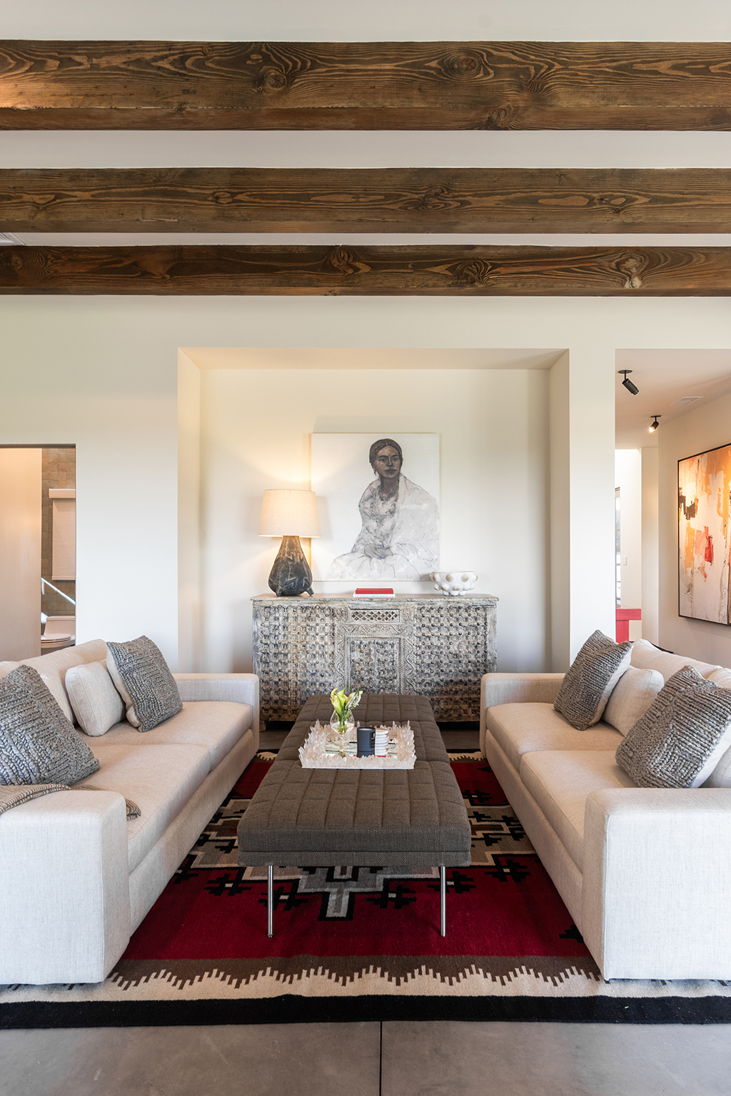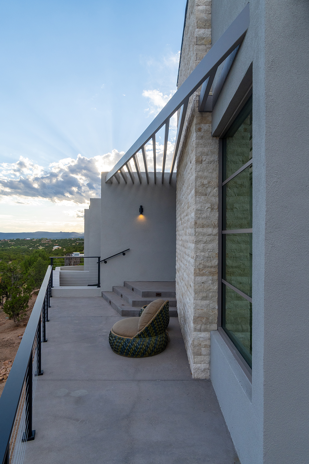 A striking steel trellis portal welcomes guests, offering both shade and a bold contemporary statement. Exposed wood beams pay homage to classic Santa Fe style, juxtaposed with smooth painted drywall throughout the home, where a floating reglet detail at the floor enhances the crisp, seamless design.
