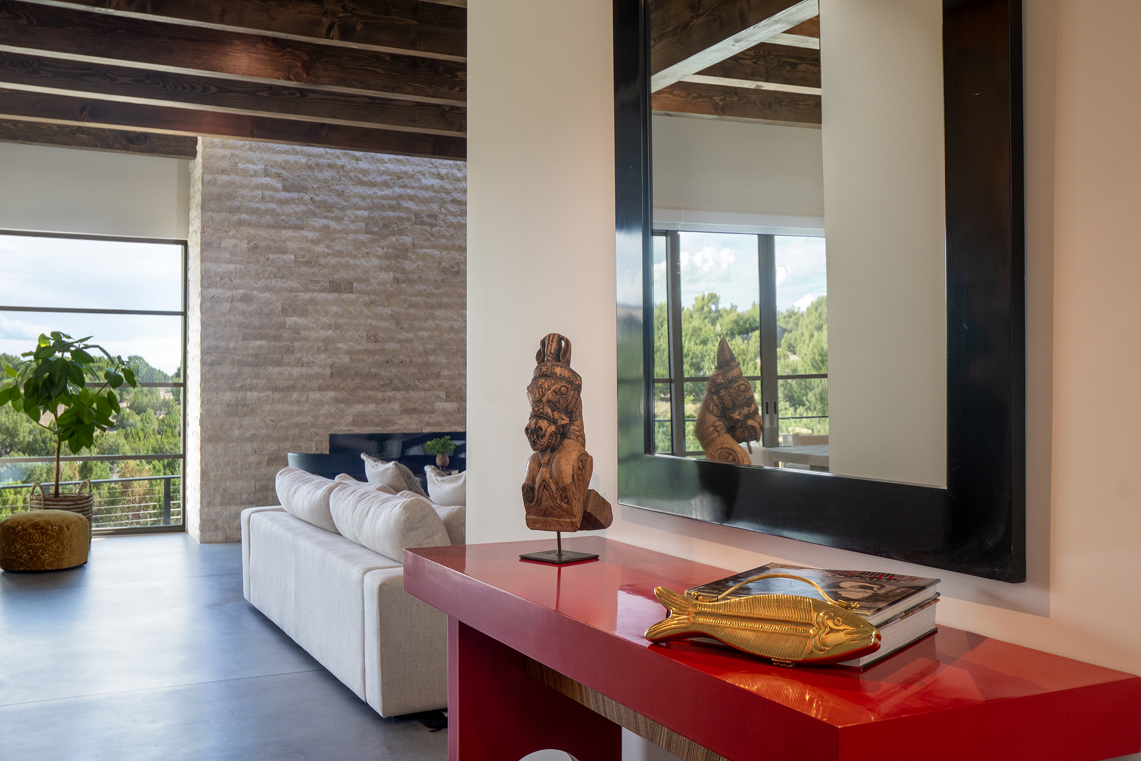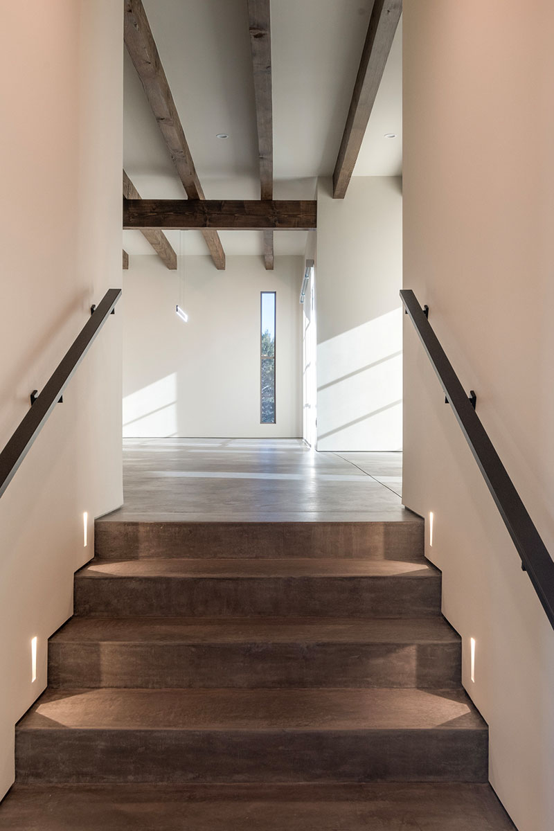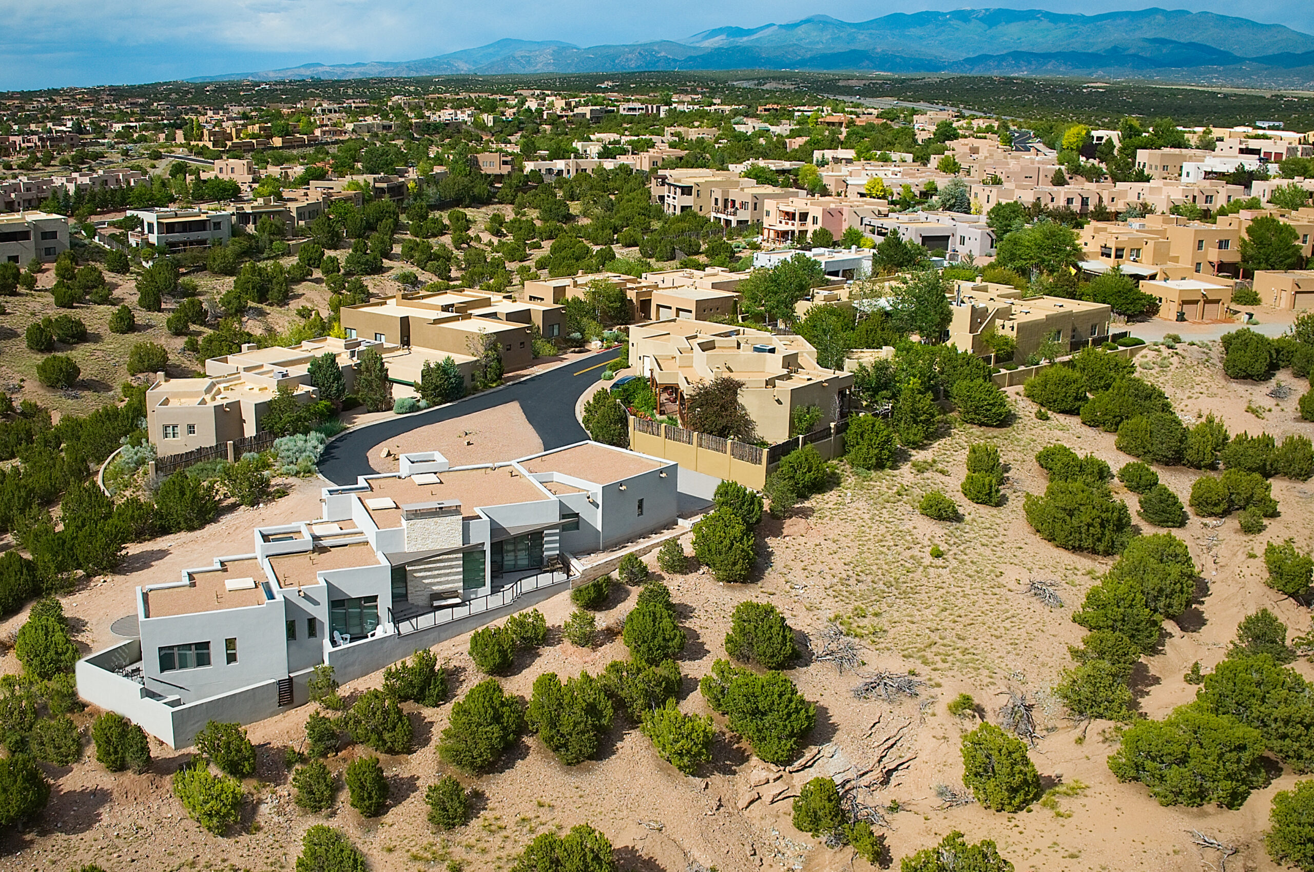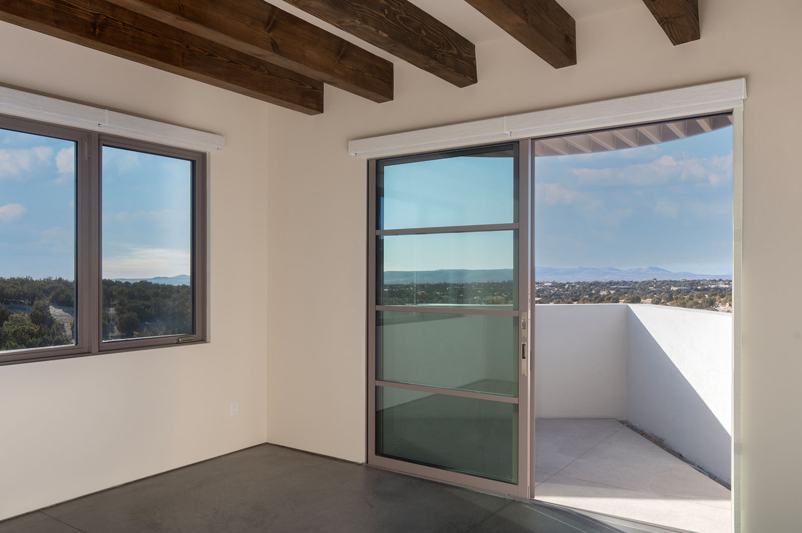 A striking steel trellis portal welcomes guests, offering both shade and a bold contemporary statement. Exposed wood beams pay homage to classic Santa Fe style, juxtaposed with smooth painted drywall throughout the home, where a floating reglet detail at the floor enhances the crisp, seamless design.