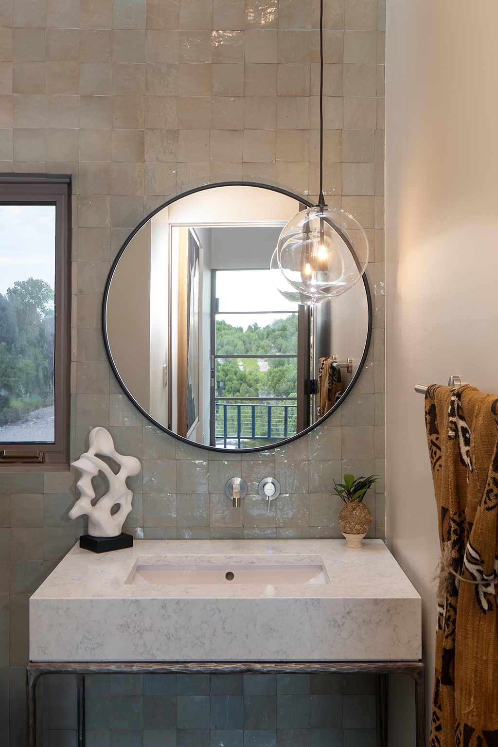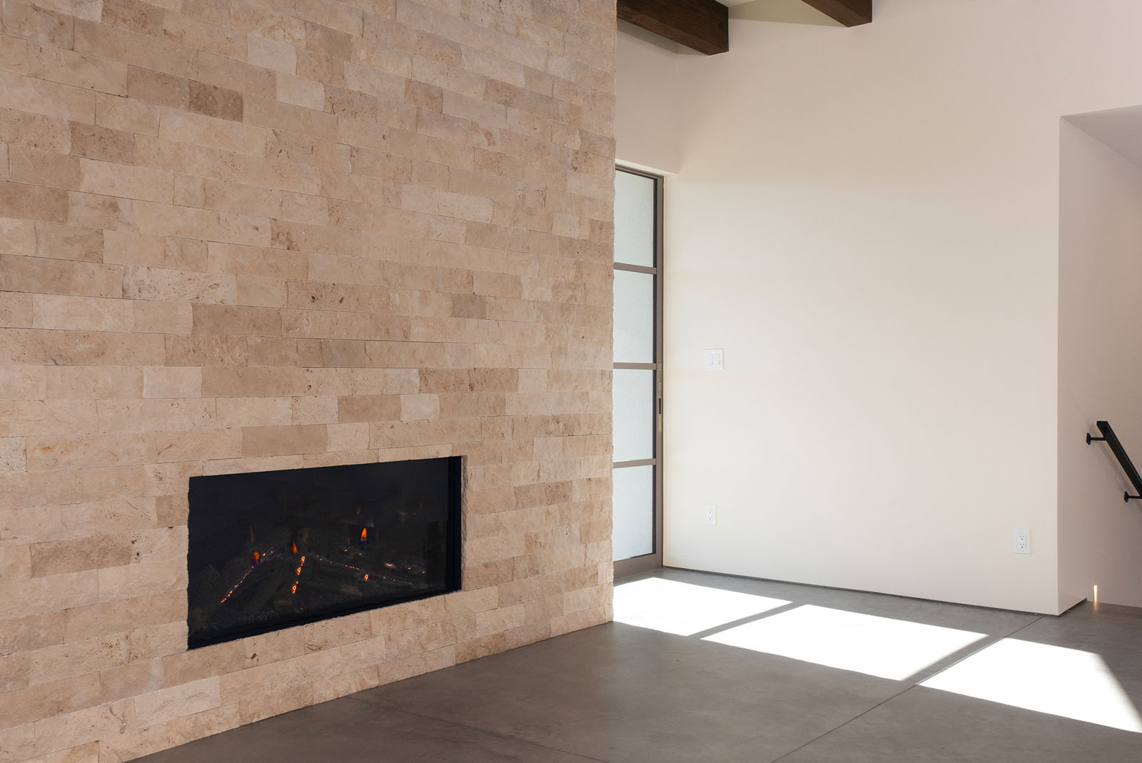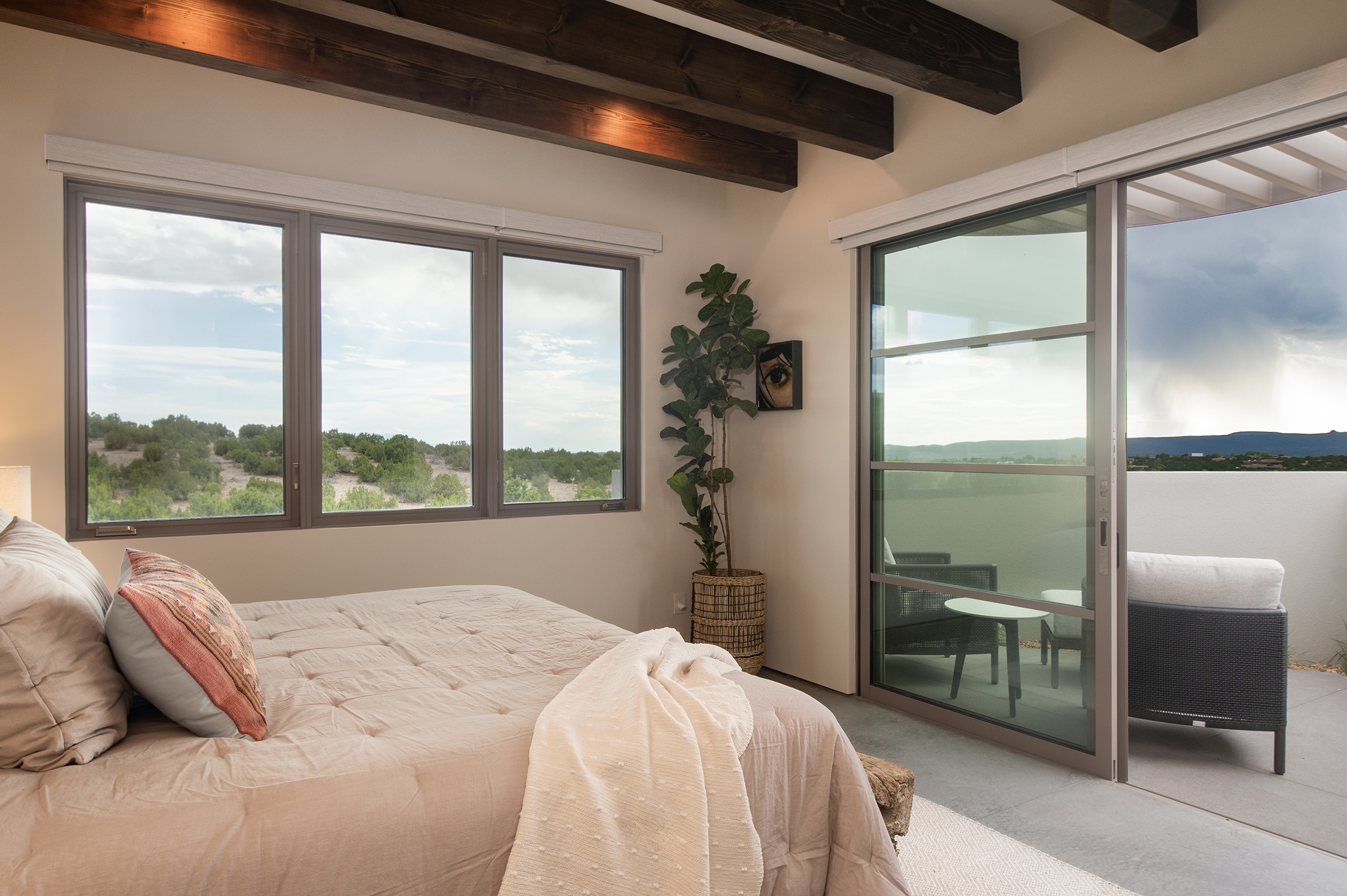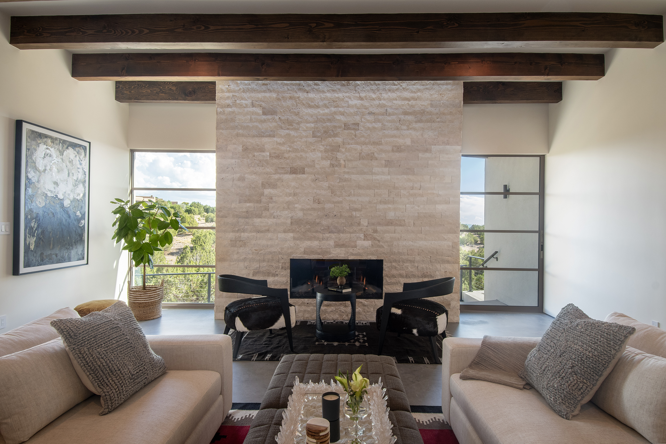 At the heart of the living space, a limestone-clad fireplace serves as both a focal point and a nod to the region’s natural beauty. This residence embodies a sophisticated yet welcoming atmosphere, where modern minimalism meets Santa Fe’s rich architectural heritage.