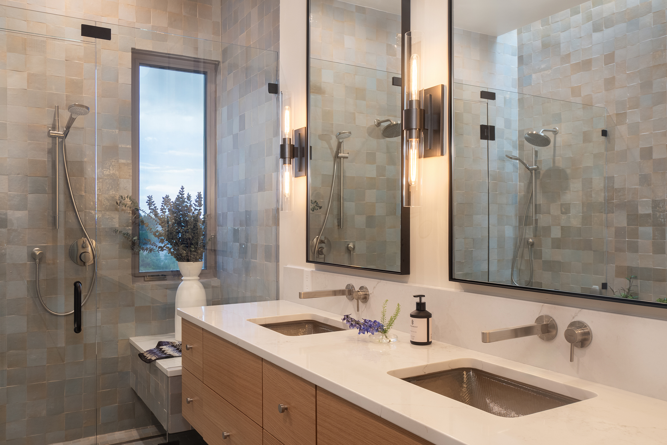 The kitchen, bathrooms, and laundry room showcase white oak cabinetry, bringing warmth and natural texture to the interiors. Handcrafted Zellige tile walls add depth and character, their subtle variations in tone catching the light beautifully. Underfoot, exposed concrete floors create a grounded, modern feel, offering durability and a raw elegance that complements the home’s refined material palette.